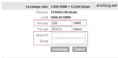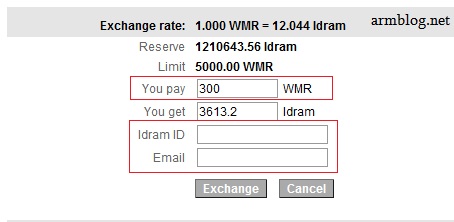 5.Գրեք գումարի չափը, Idram-ի ID-ն (կարող եք վերցնել Idram կայքից), Ձեր էլեկտրոնային փոստի հասցեն և սեղմեք Exchange: